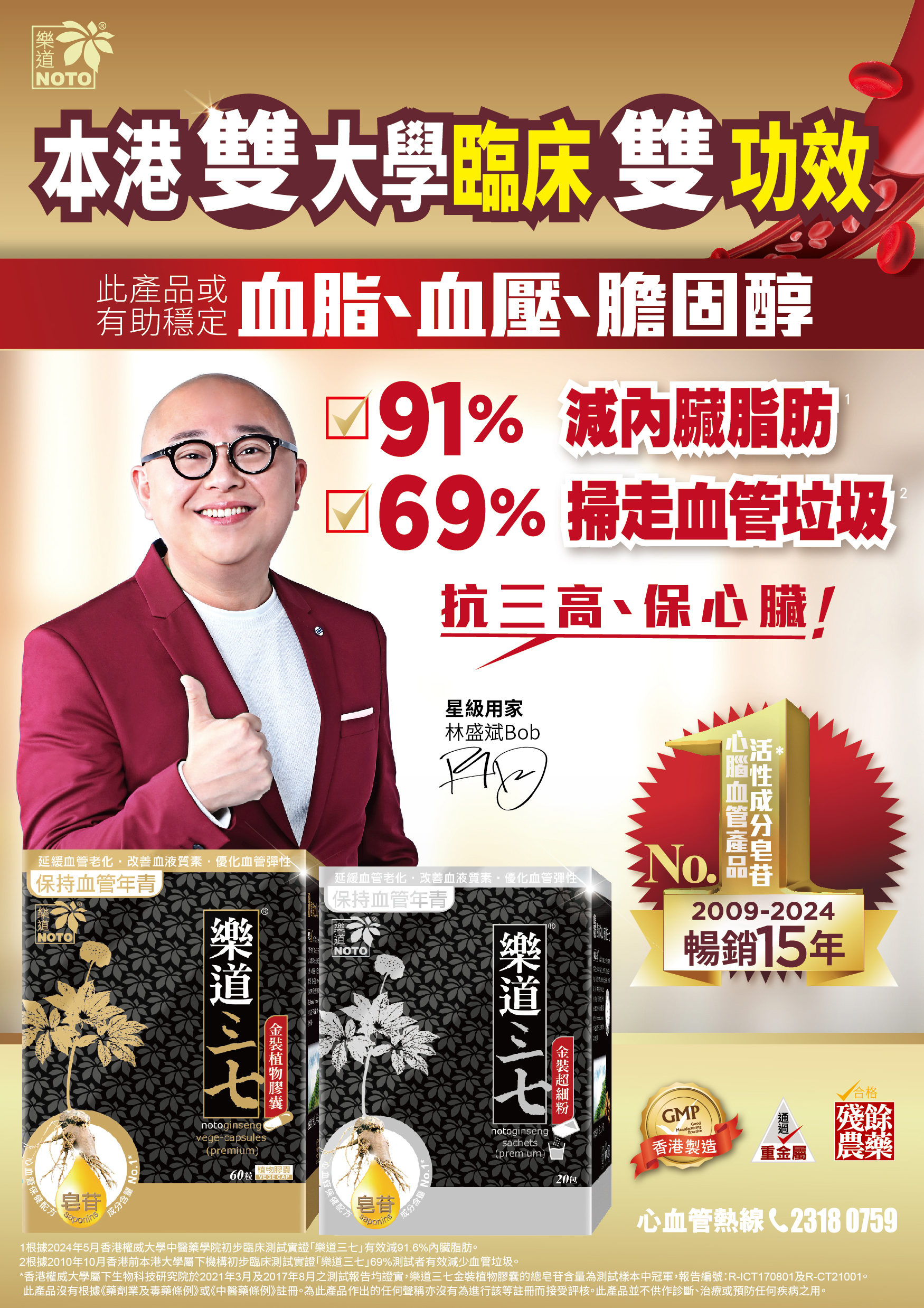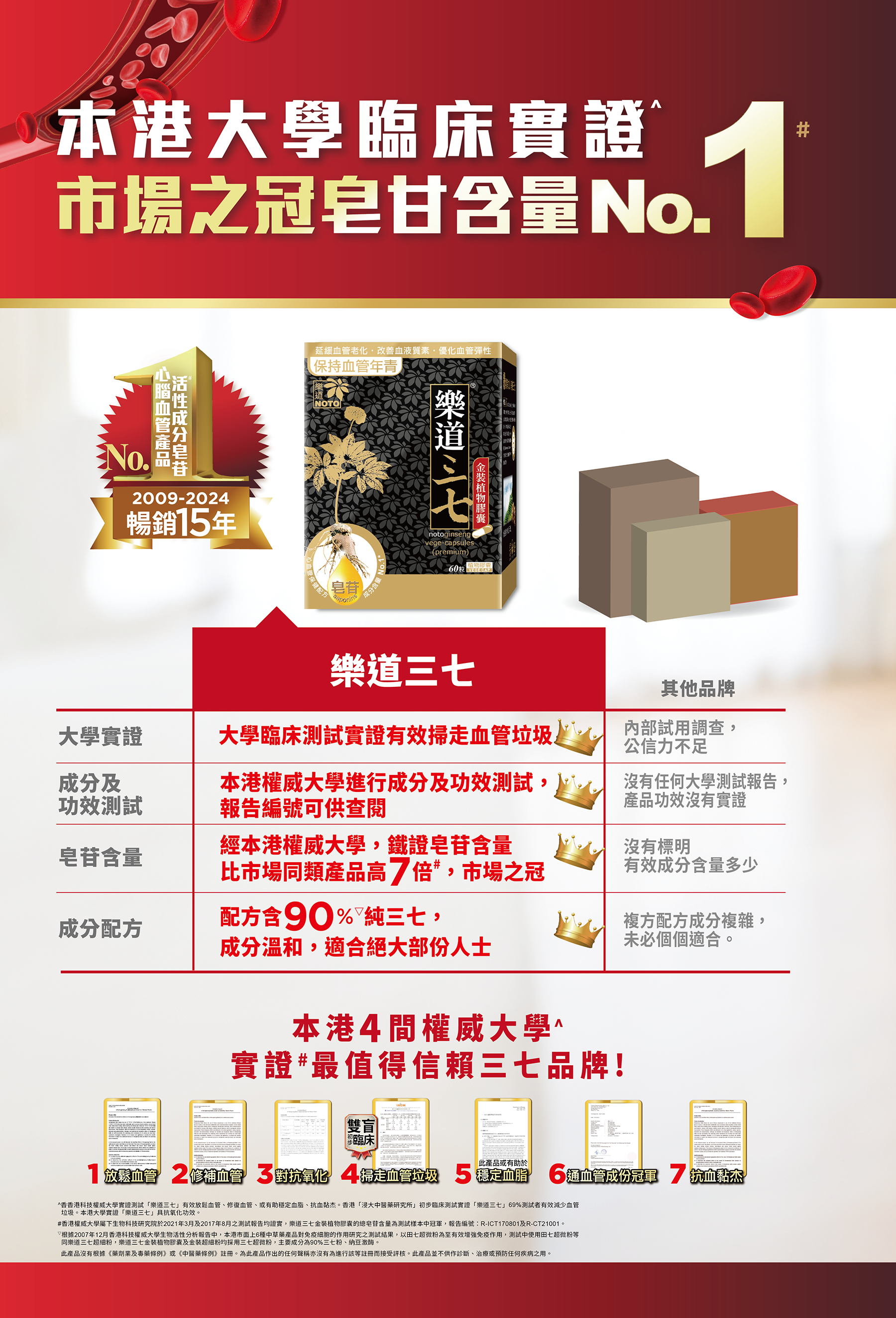 「樂道三七」市場唯一獲得本港雙大學臨床實證,有效91%減內臟脂肪1,及69%掃走血管垃圾2。「樂道三七」亦獲本港權威大學測試鐵證,總皂苷含量屬市場No.1#,功效顯著,抗三高、保心臟、強化心血管,修補及放鬆血管,使血管暢通乾淨;或有助穩定血脂、血壓、膽固醇。增強免疫力r。暢銷全港15年,信心保證。