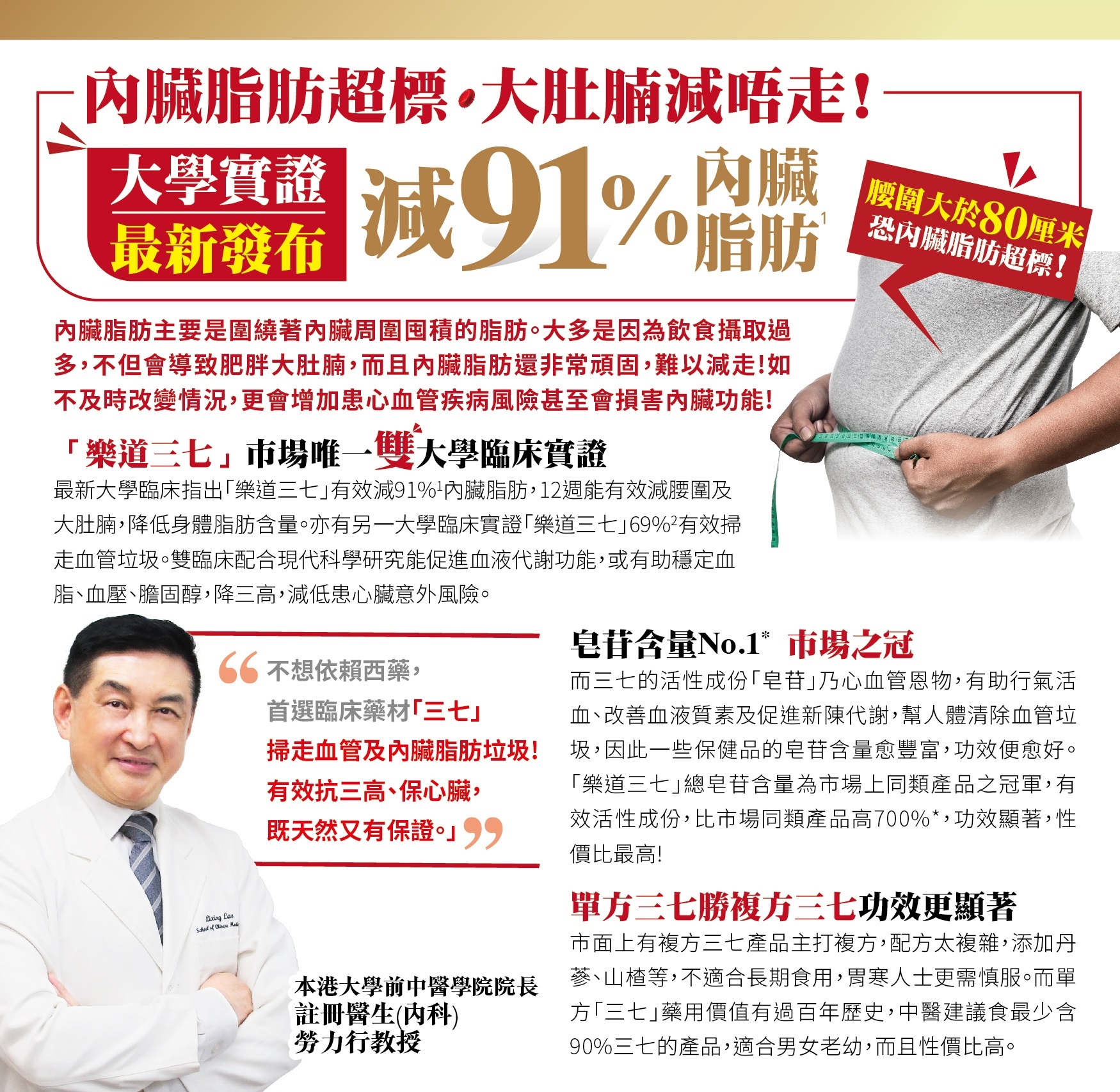 1根據2024年5月香港權威大學中醫藥學院初步臨床測試實證「樂道三七」有效減91.6%內臟脂肪。