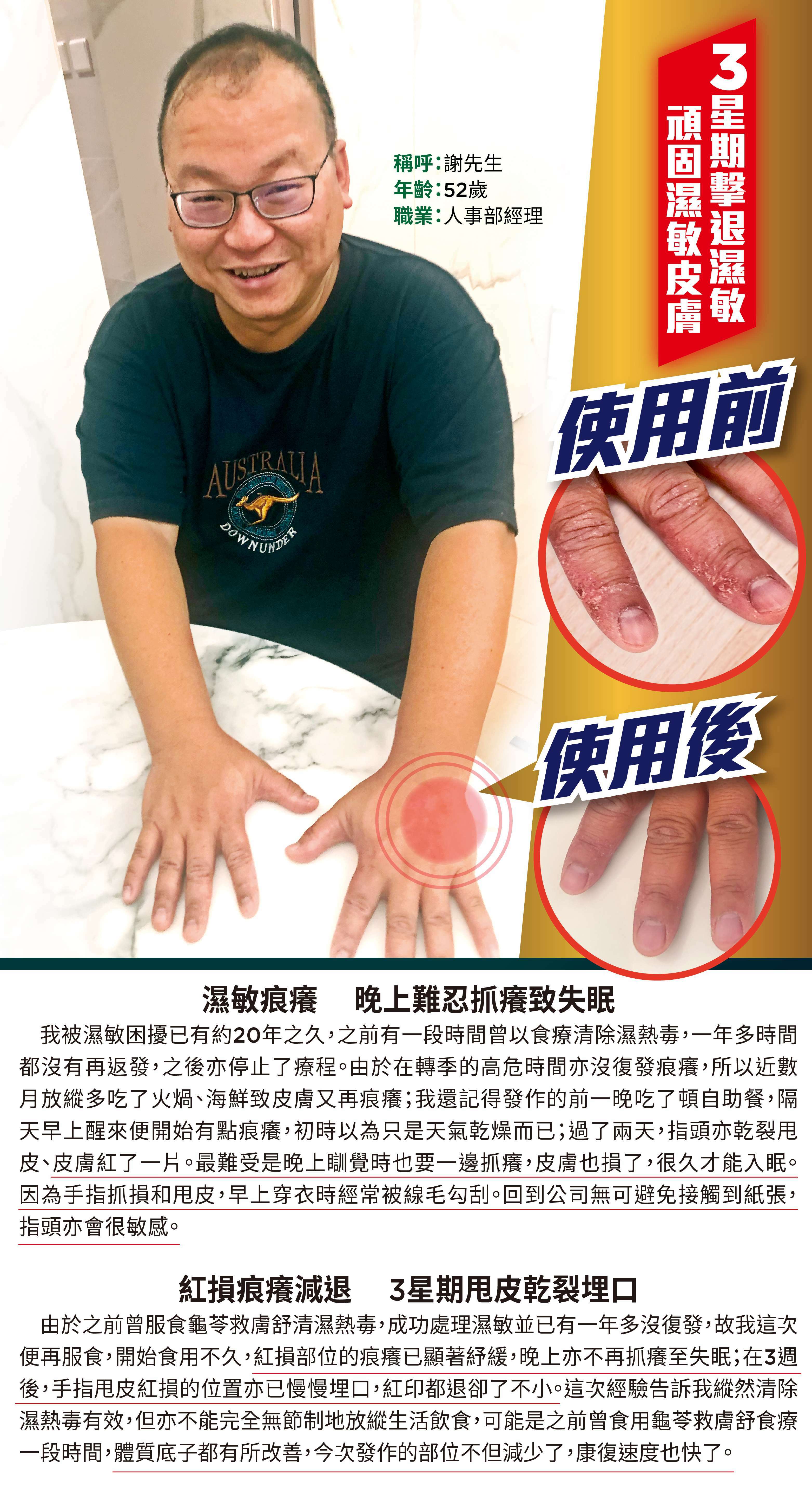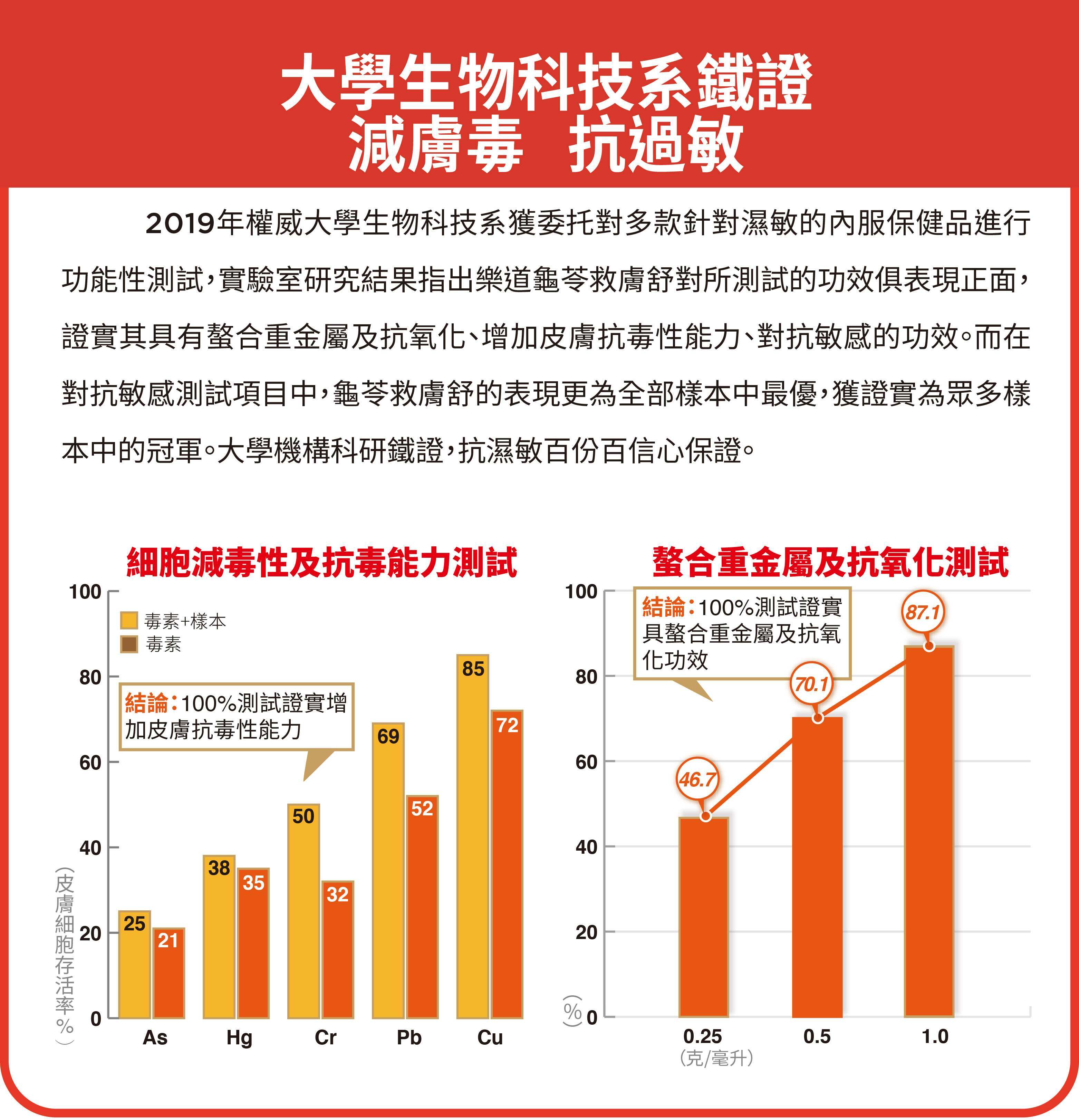 《龜苓救膚舒》採用「國家衛生部門」所頒布龜苓膏標準成份為配方基礎,並配伍多種針對皮膚症狀的草本漢藥改良,以加強清除濕、熱、毒功效,從根本調理,達至深入清除濕敏之效。濃縮配方含豐富份,並添加專利紫蘇籽萃取,有效對抗濕敏痕、紅等症狀。