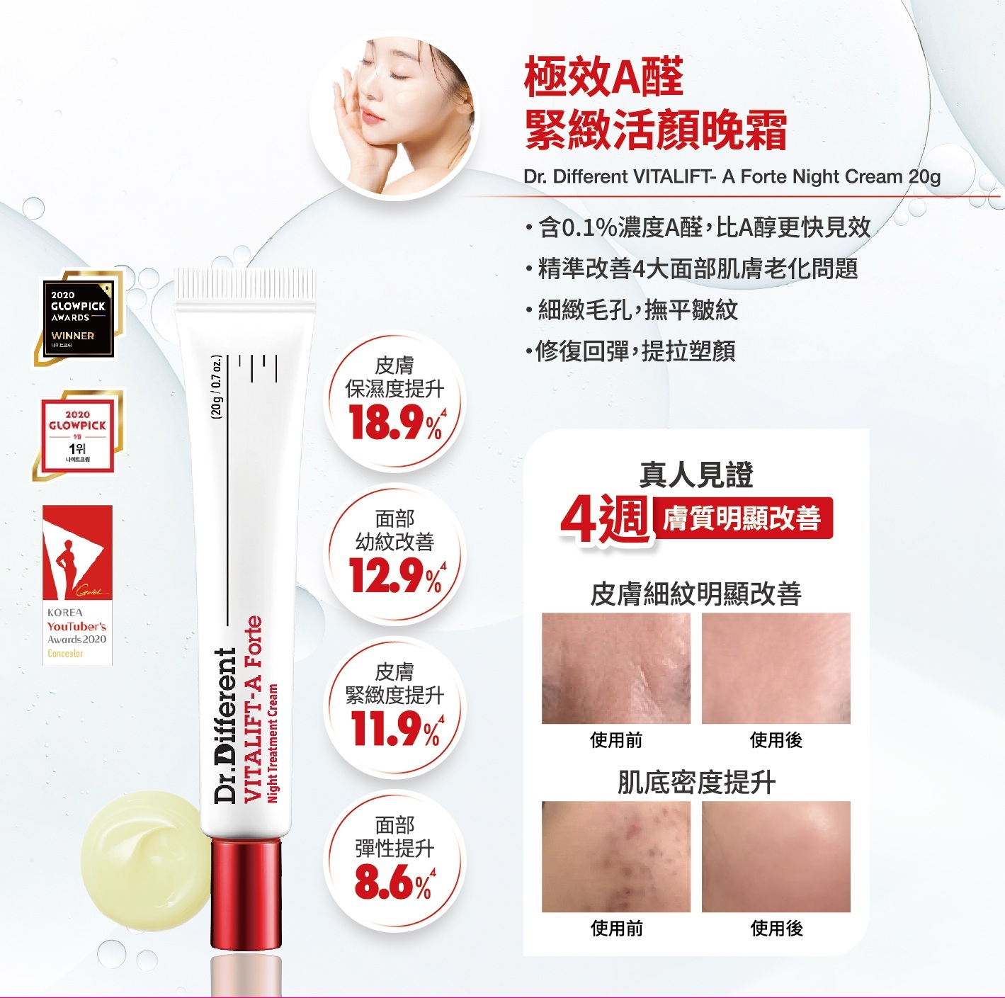 - 專門針對初老症狀,包括細紋、鬆弛、乾燥及皮膚老化,改善皮膚彈性