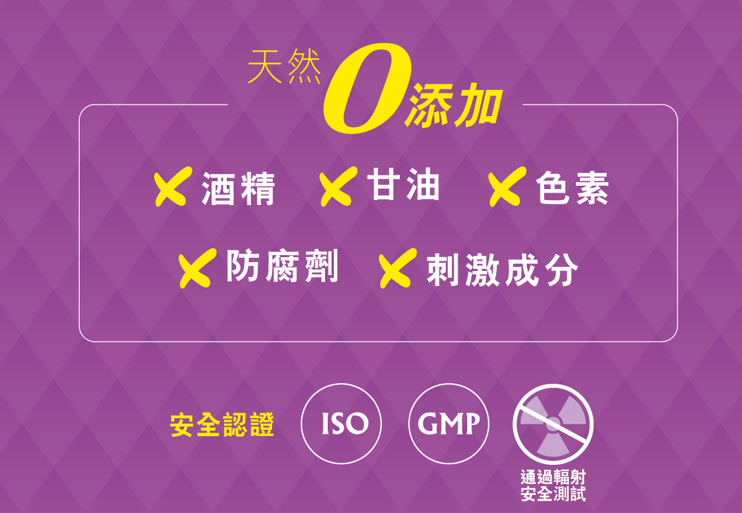 • 無防腐劑 • 無酒精 • 無色無味 • 無刺激成份