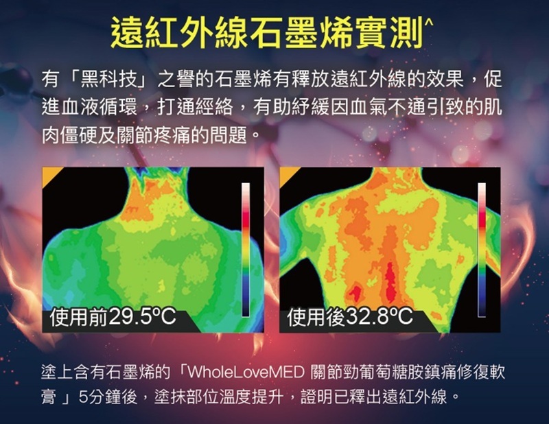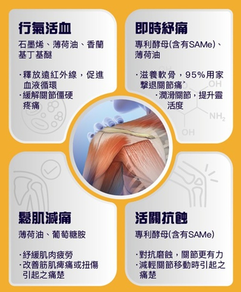「愛完全醫學系列 關節勁葡萄糖胺鎮痛修復軟膏」嚴選5大強效成分,一搽極速滲透,即時鎮痛,再活血通絡,舒緩關節肌肉疼痛、僵硬不適等,更有助修復軟骨,養護關節及軟骨健康。產品採用嶄新的「黑科技」石墨烯,吸收人體的熱量釋放出遠紅外線,加速血液微循環,撃退因氣血、毒素瘀窒引致之關節痛。市場少有先涼後熱關節軟膏,先鎮痛,後紓緩,極致舒適。100%用家認同即時鎮痛>,效果顯著。