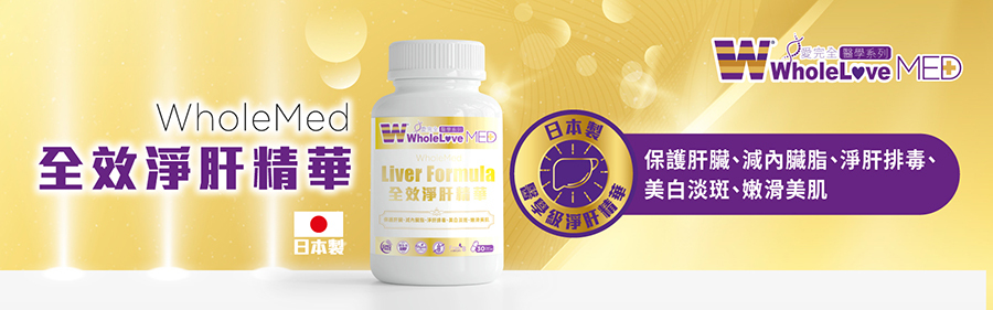 WholeLove MED全效淨肝精華擁有全效配方,比起市面上一般肝產品含有更多功效成分,全面強化及保護肝臟。成分中除了有醫生推選之德國肝內磷脂,更有「肝臟守護神」之稱的水飛薊,水飛薊為美加肝產品常用配方,除可化解肝臟毒素,更有助抗炎、 抗纖維化。獨有專利成分微分子水溶性薑黃,較一般薑黃粉更易被人體吸收,更有助降低脂肪在肝臟的沉積。產品更含美容熱門成分-穀胱甘肽,除清肝排毒外,更有助保濕、美白及淡化細紋,改善面黃及因肝而造成的皮膚問題。每日只需1至2粒,足夠清肝排毒,改善膚色,全面保護肝臟健康。