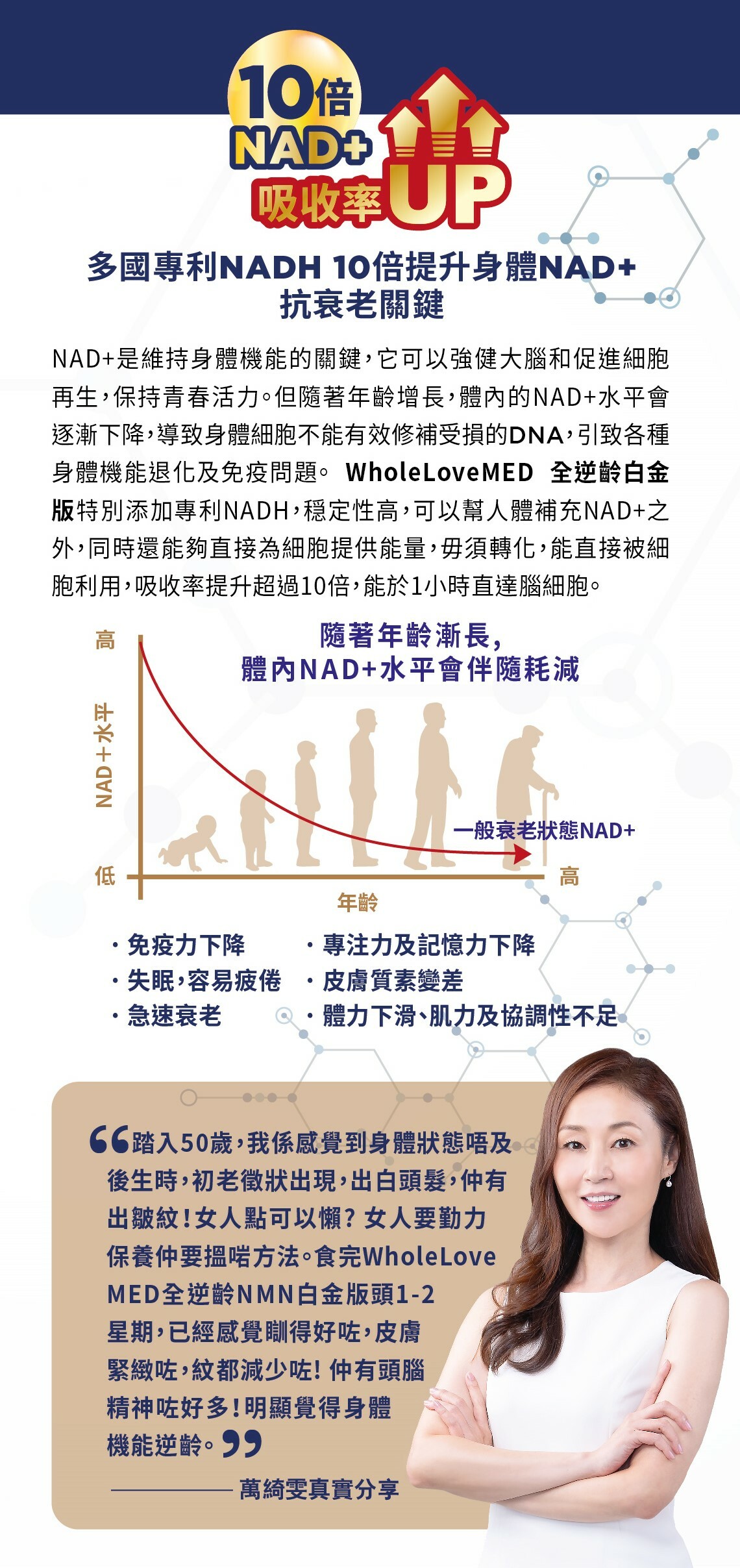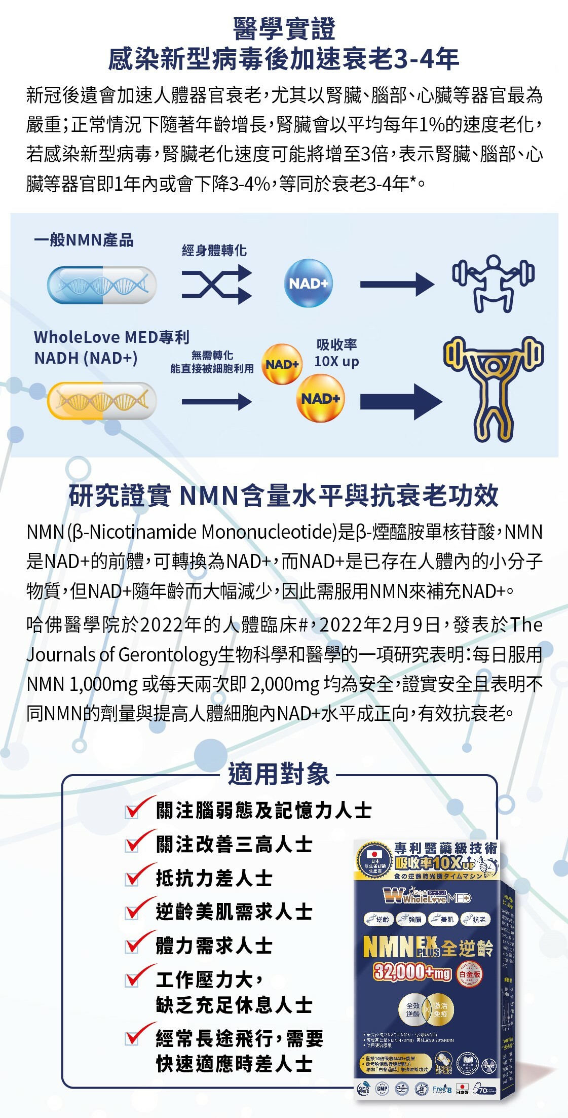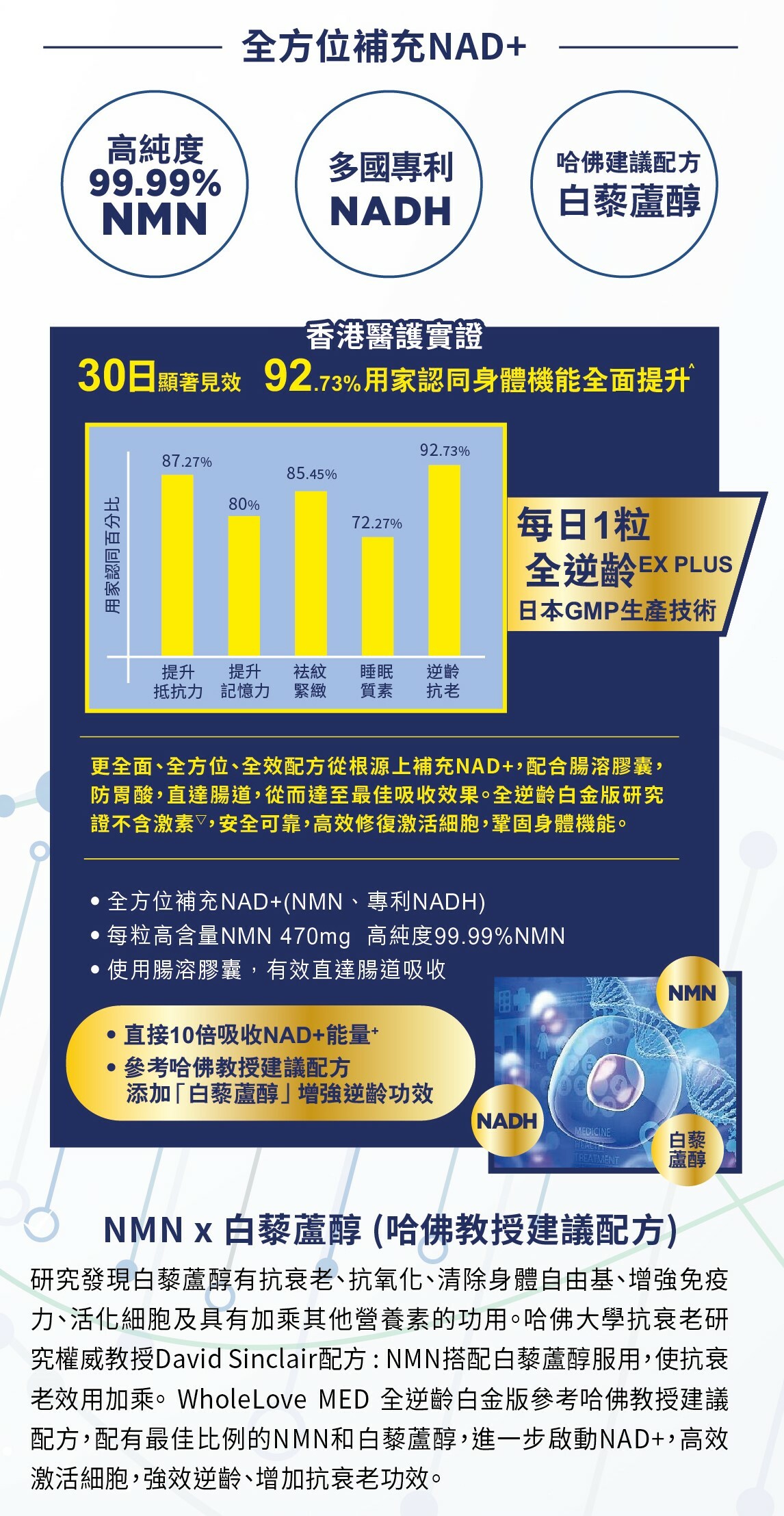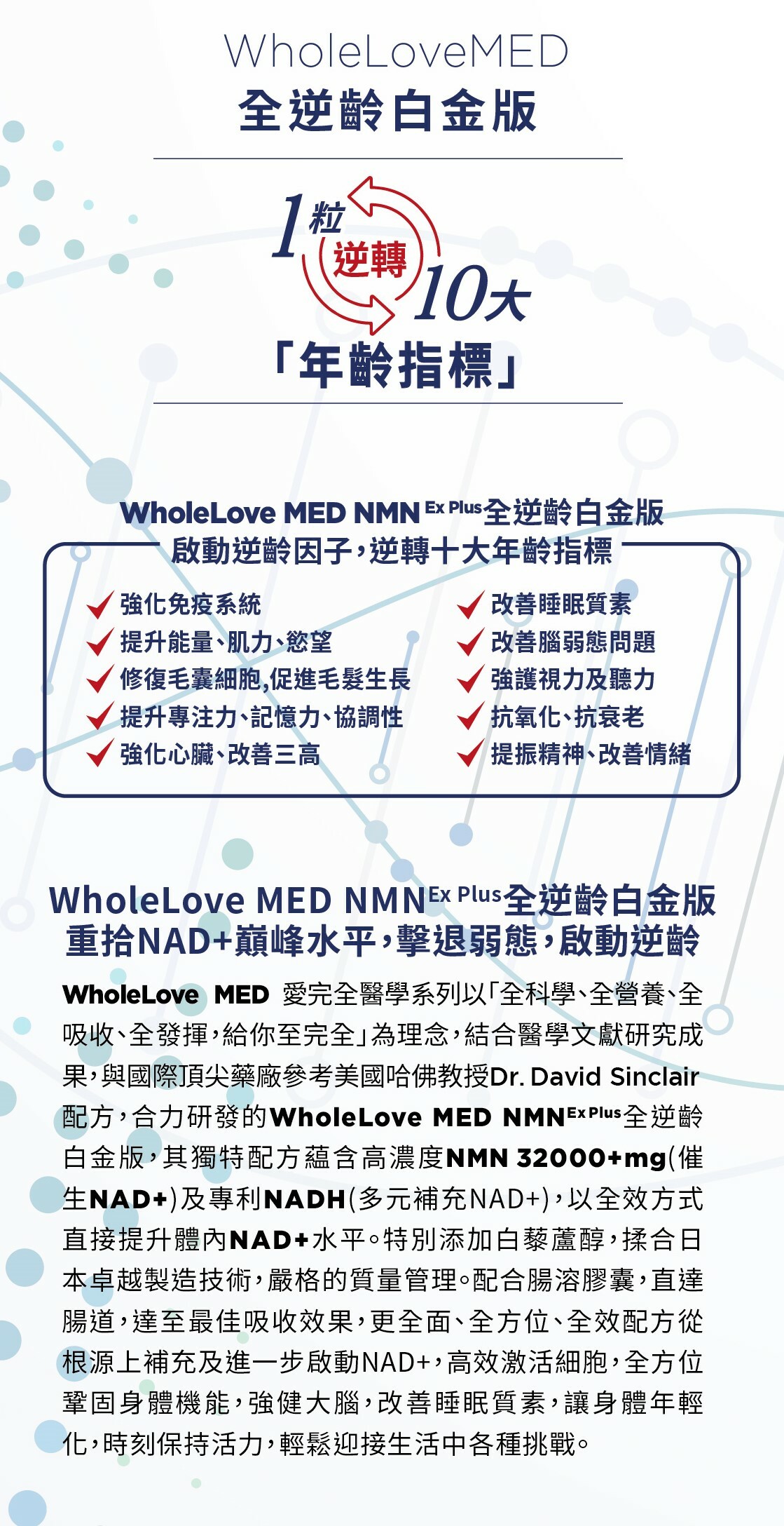 結合醫學文獻研究成果,與國際頂尖藥廠參考美國哈佛教授Dr. DavidSinclair配方,合力研發的【WholeLove MED NMN Ex+ 全逆齡白金版】,其獨特配方蘊含高濃度NMN 32000 +mg及專利NADH,10倍提升體內NAD +水平。特別别添加天然白藜蘆醇,貼近哈佛教授建議配方,揉合日本卓越製造技術,嚴格的質量管理。進一步啟動NAD +,高效強護激活細胞,全方位鞏固身體機能,強健大腦,改善睡眠質素,讓您重回年輕巔峰狀態,時刻保持活力,輕鬆迎接生活中各種挑戰。