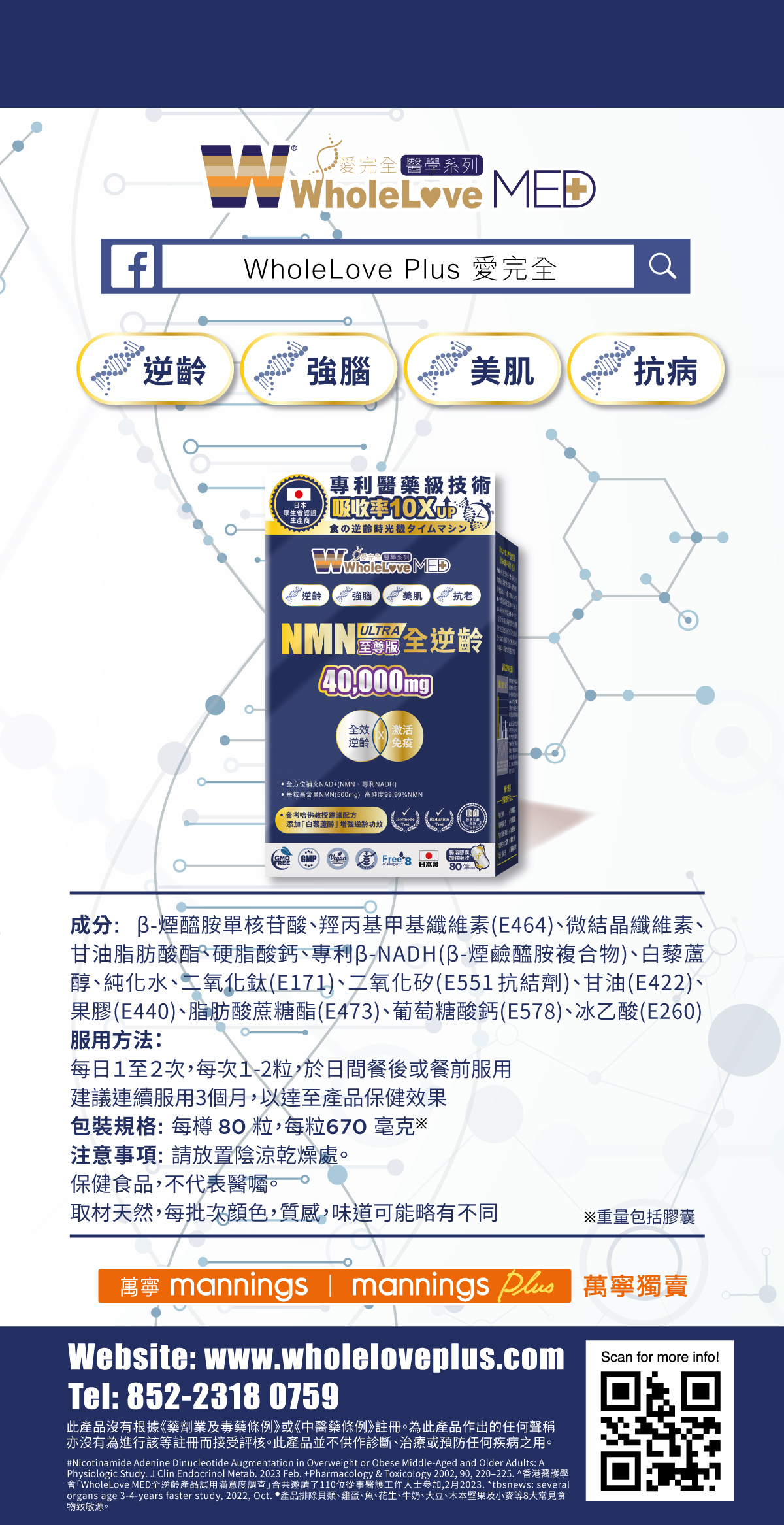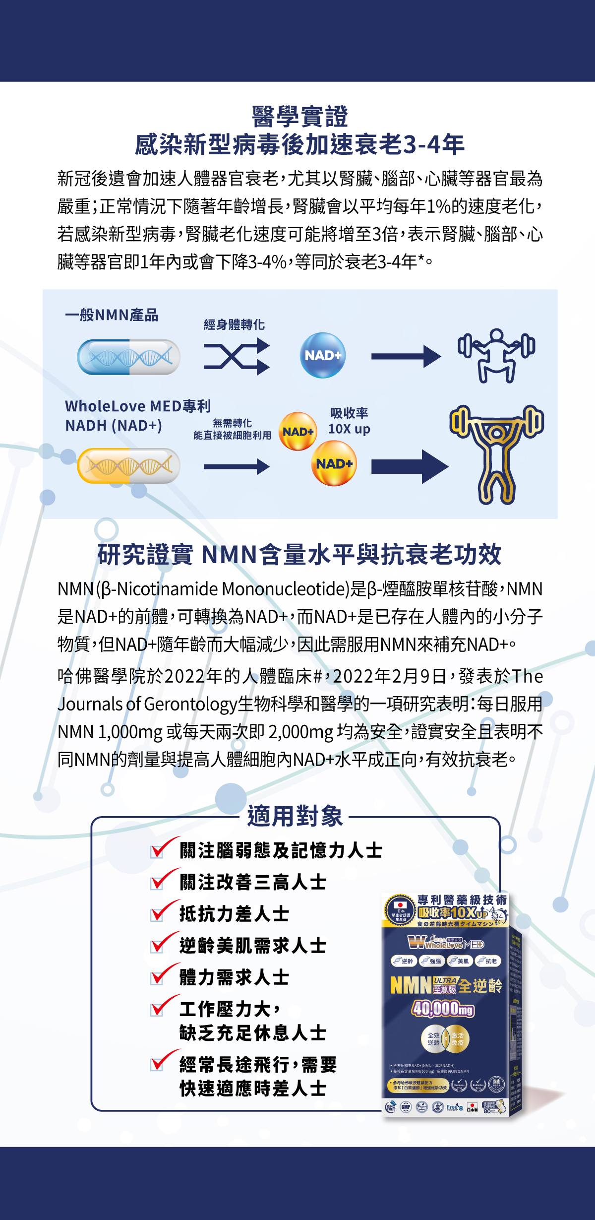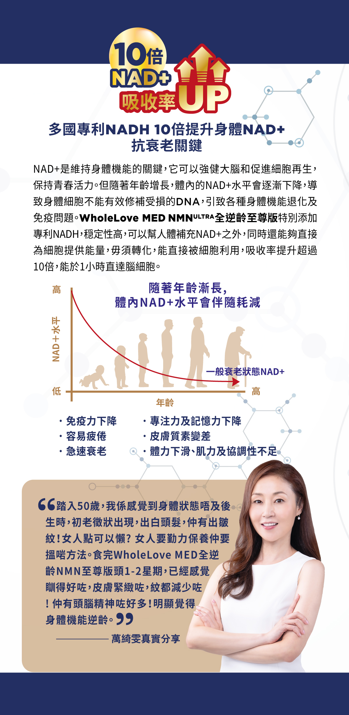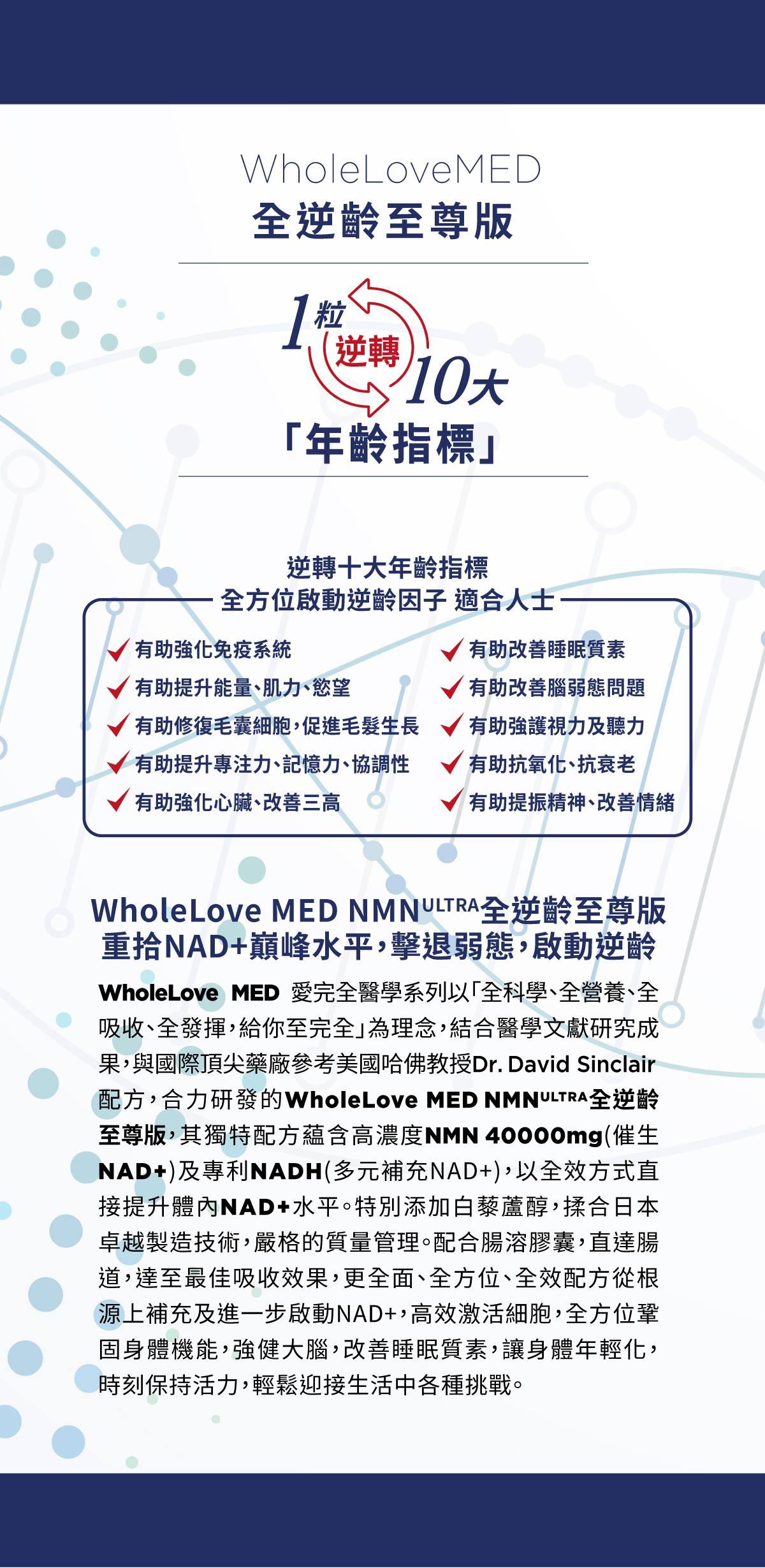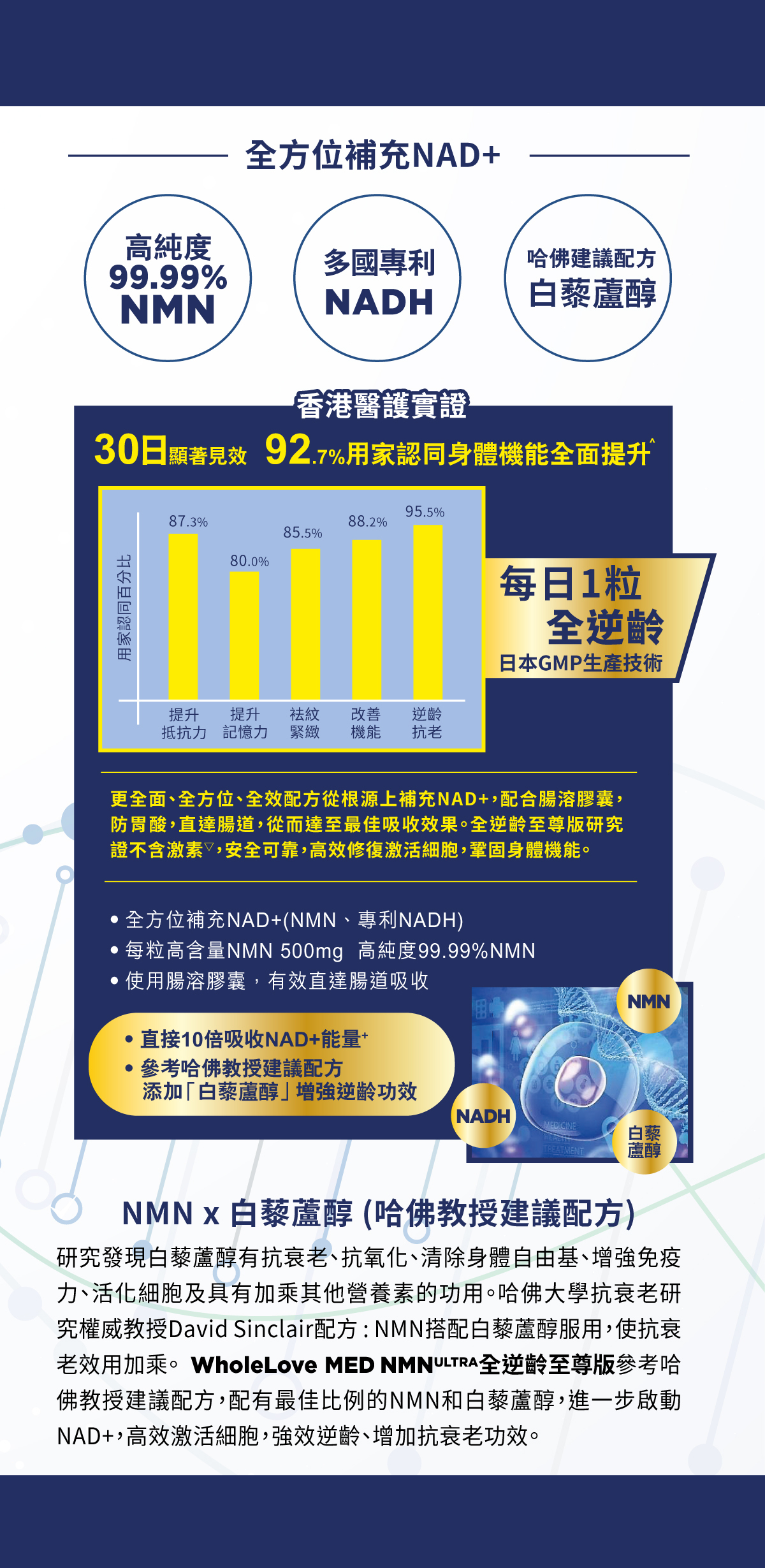 結合醫學文獻研究成果,與國際頂尖藥廠參考美國哈佛教授Dr. DavidSinclair配方,合力研發的【WholeLove MED 全逆齡至尊版 NMN 40,000mg (80粒)】,其獨特配方蘊含高濃度NMN 40000mg及專利NADH,10倍提升體內NAD +水平。特別别添加天然白藜蘆醇,貼近哈佛教授建議配方,揉合日本卓越製造技術,嚴格的質量管理。進一步啟動NAD +,高效強護激活細胞,全方位鞏固身體機能,強健大腦,改善睡眠質素,讓您重回年輕巔峰狀態,時刻保持活力,輕鬆迎接生活中各種挑戰。