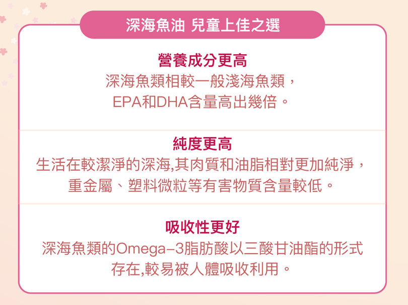 配方添加源太平洋深海魚類之深海魚油,蘊含Omega-3脂肪酸DHA,有助促進大腦發展及神經機能健康,提升兒童的學習能力、記憶力及專注力,是兒童成長的必要元素。