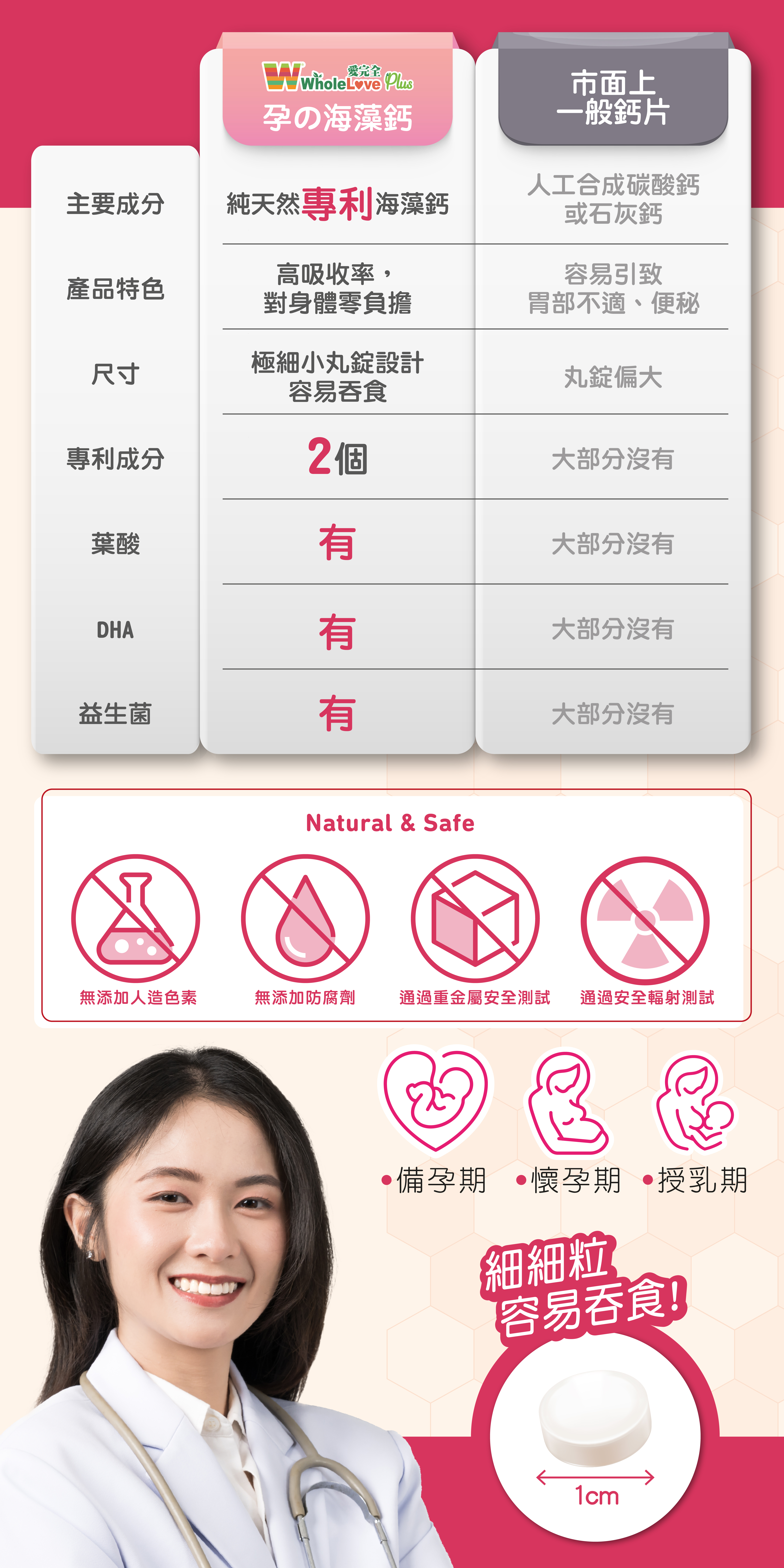 • 含 2 種專利成分及維他命 D3、專利益生菌、葉酸和 DHA,促進母體和胎兒骨骼健康