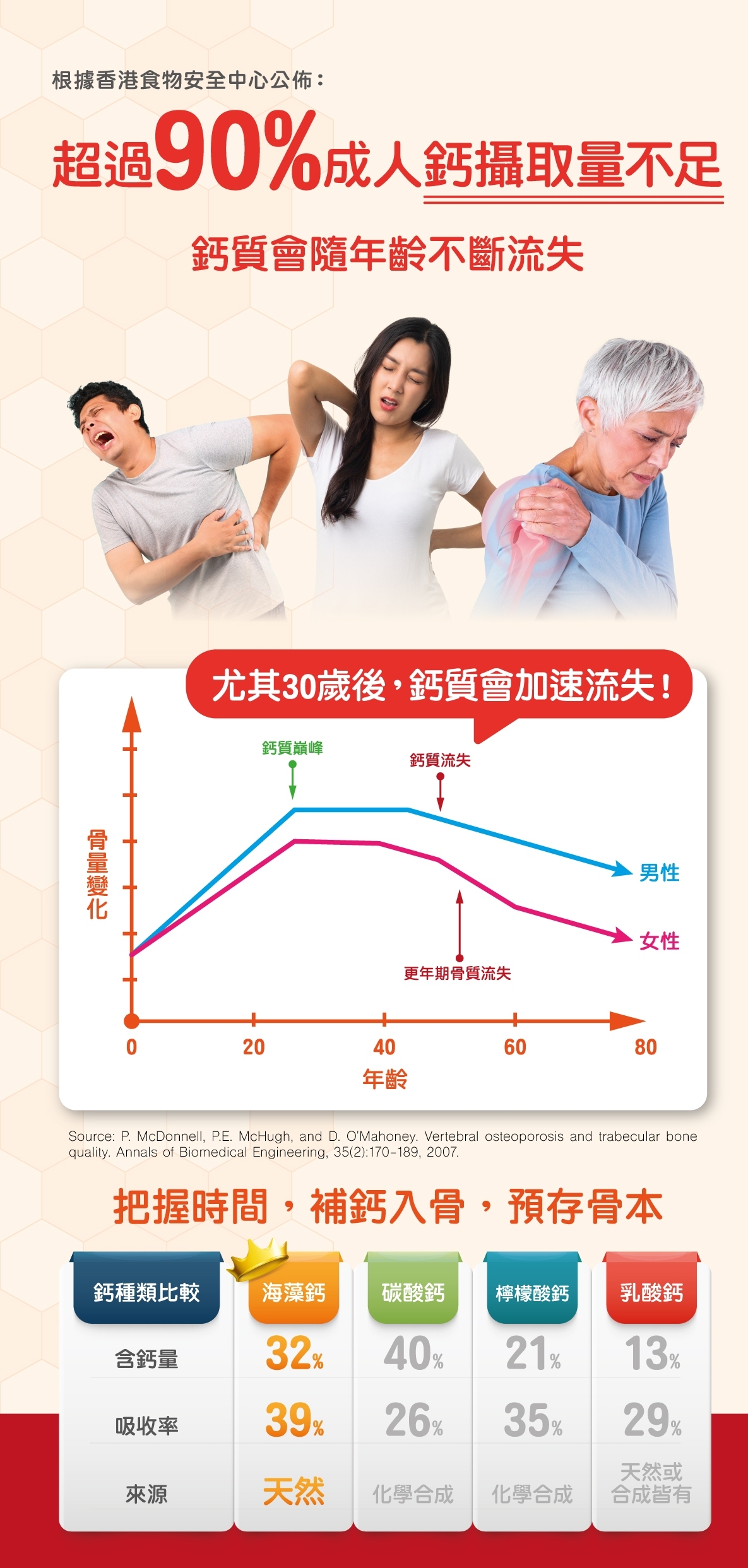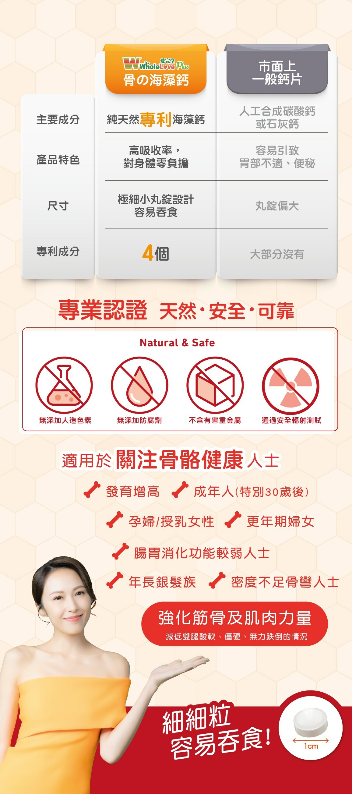 • 4大專利成分+維他命D3,提升骨質密度,預防及減緩骨質疏鬆