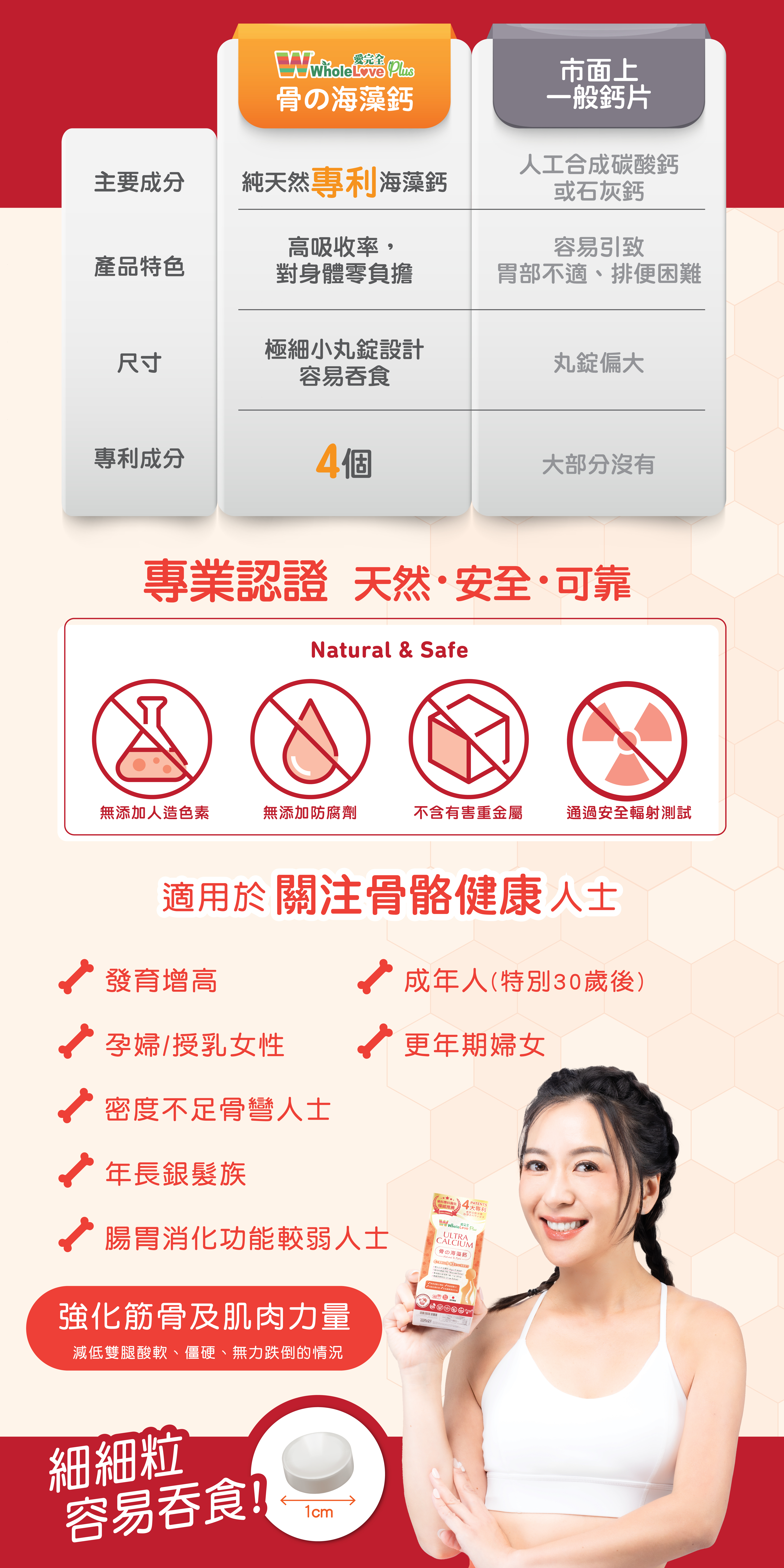 愛完全 「骨の海藻鈣」採用深海天然紅海藻鈣,更易被人體吸收。集合4大專利成分及維他命D3等有效成分,建立3效RAL強骨配方,針對三大黃金補鈣關鍵:補鈣、吸鈣、鎖鈣,提升吸收率,同時堵截骨質流失,激活造骨細胞和抑制破骨細胞,全方位提升骨質狀態。配方更獲骨科專科醫生權威推薦,日本製造。