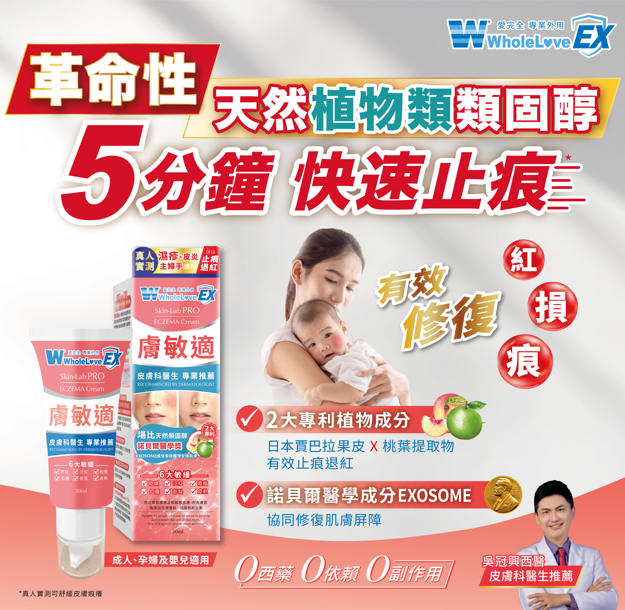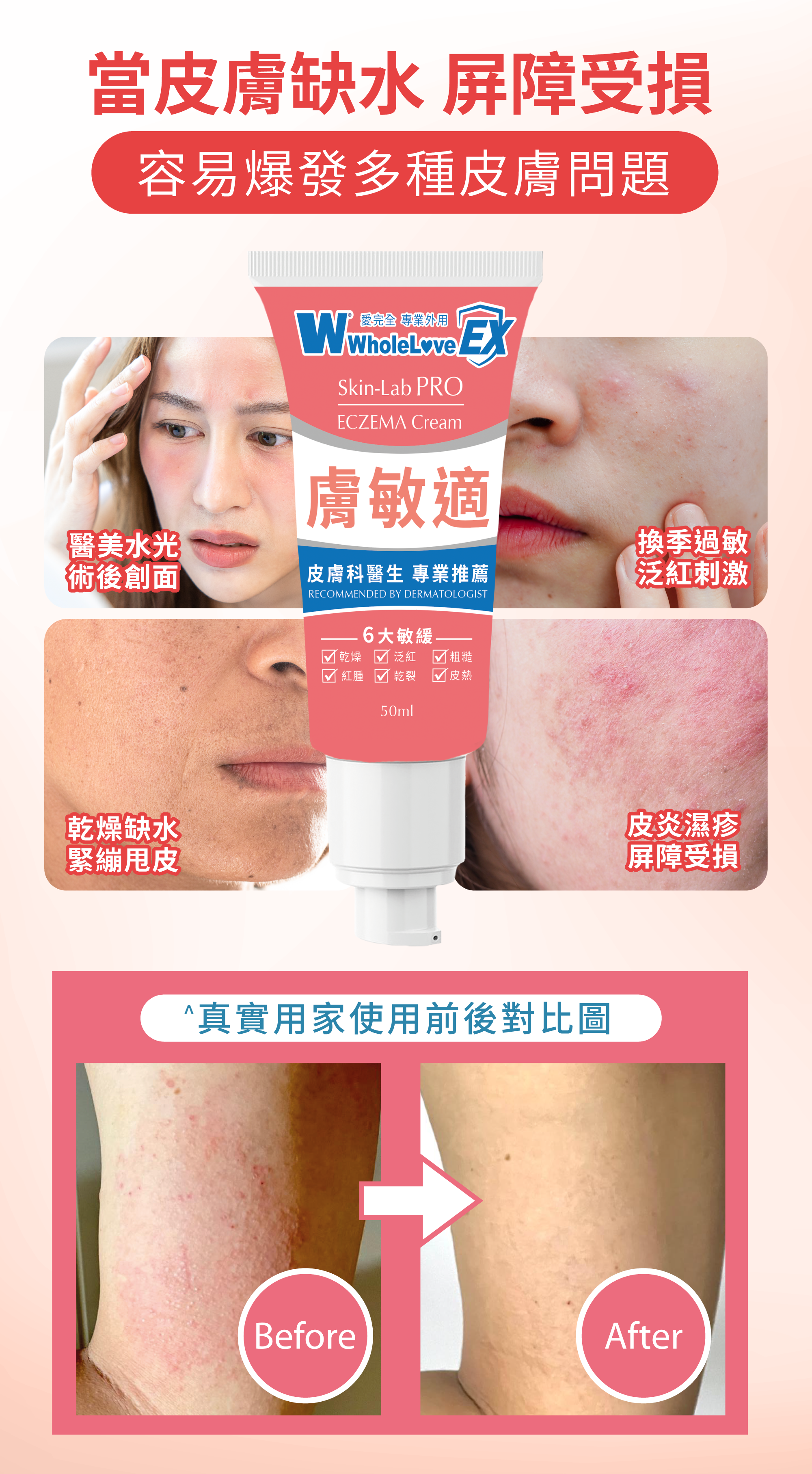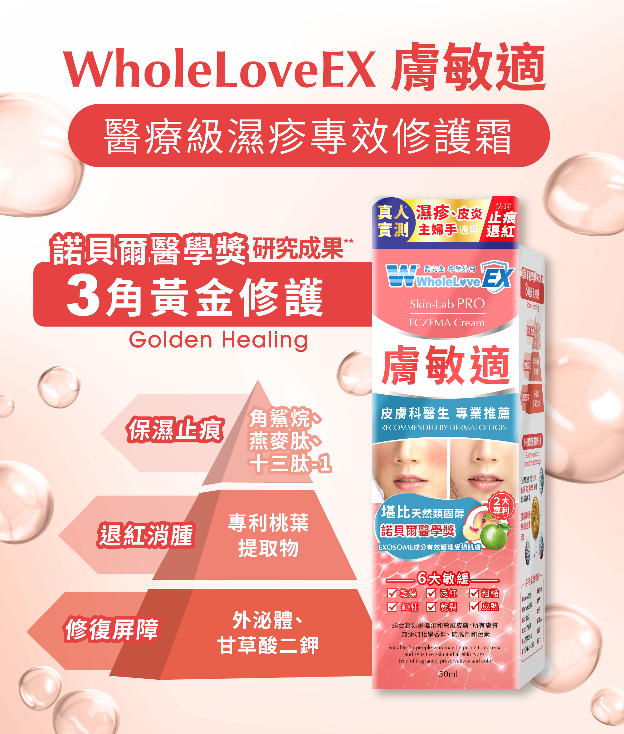WholeLove EX愛完全專業外用膚敏適利用專利修護配方,能快速緩解濕疹肌膚的紅腫痕癢不適。採用兩大專利成分以及醫學級修護成分甘草酸二鉀+外泌體(Exosome)+十三肽-1突破性舒緩配方,科學修護脆弱肌膚。