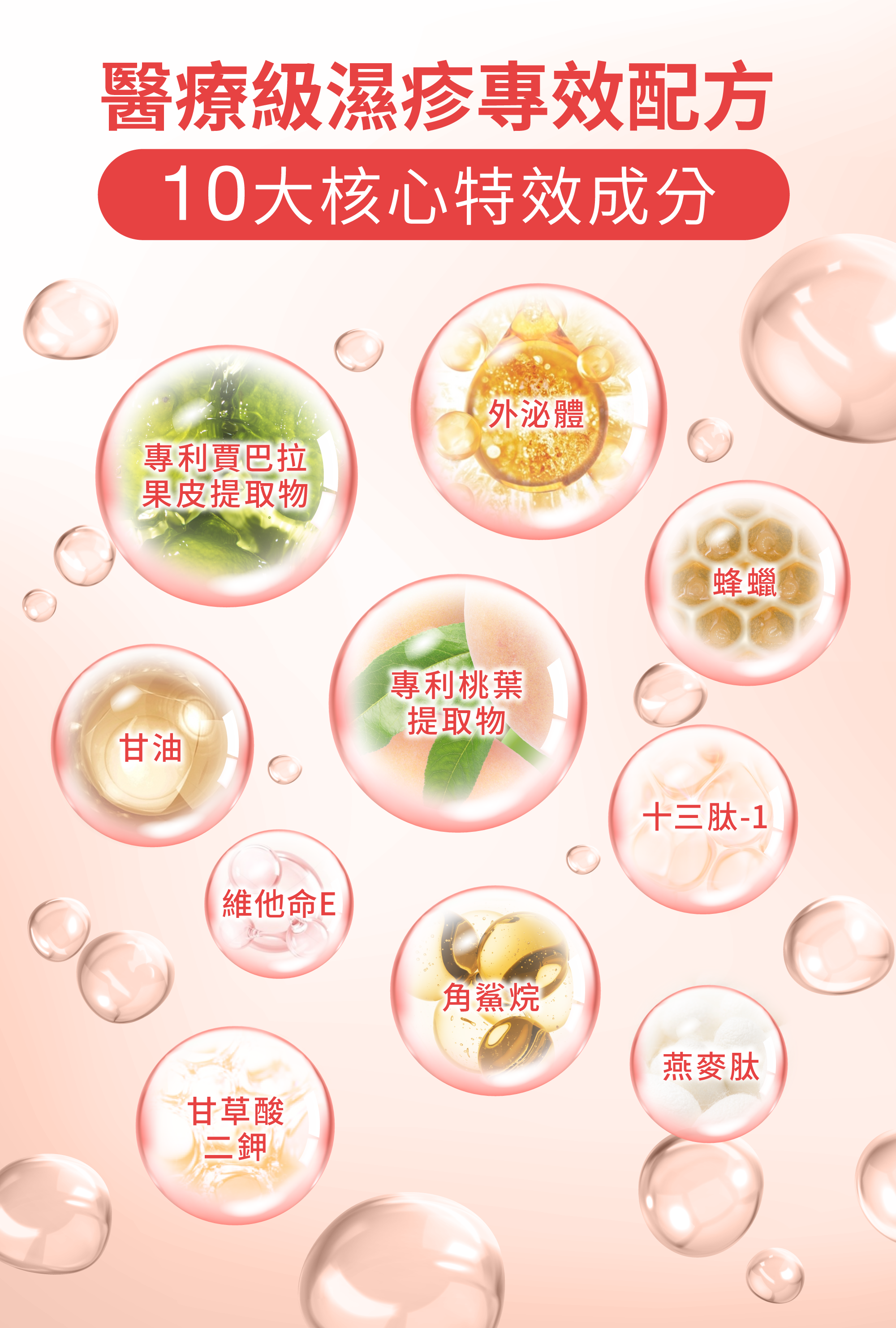 主要成分:水、甘油、角鯊烷、蜂蠟、外泌體、甘草酸二鉀、維他命E、十三肽-1、 專利賈巴拉果皮提取物、燕麥肽、專利桃葉提取物