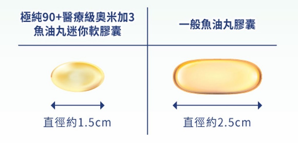 「愛完全醫學系列極純90+ 醫療級奧米加3魚油丸」採用新一代軟膠嚢,膠嚢尺寸比一般魚油膠囊細小,更易吞服,尤其適合有長者或有吞嚥問題之人士服用。