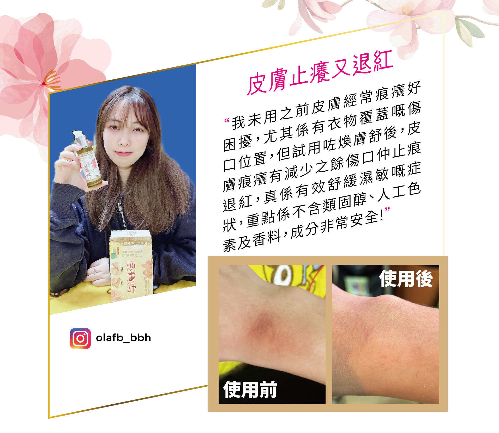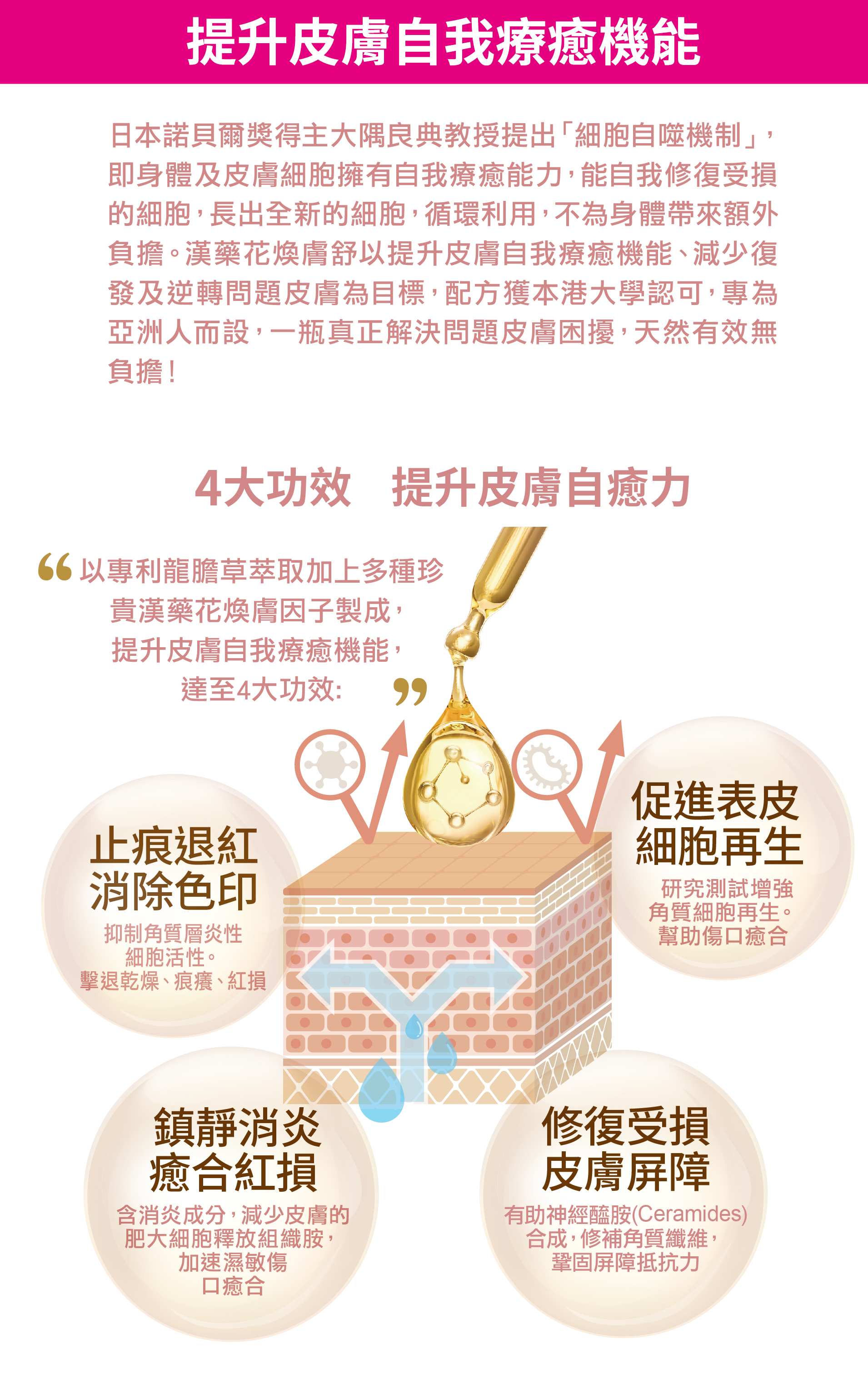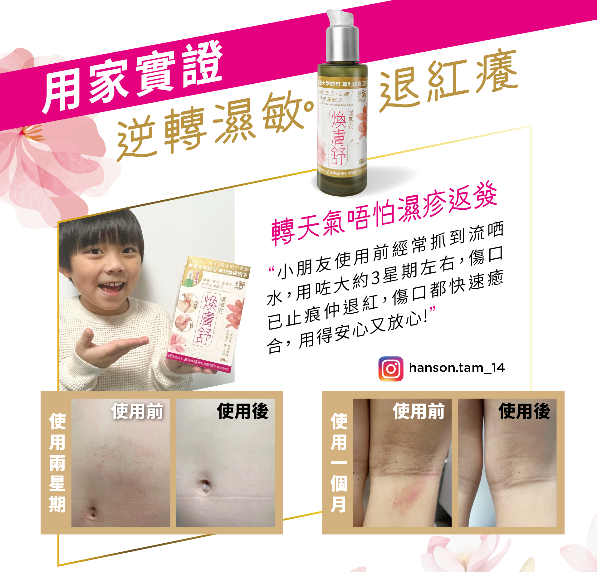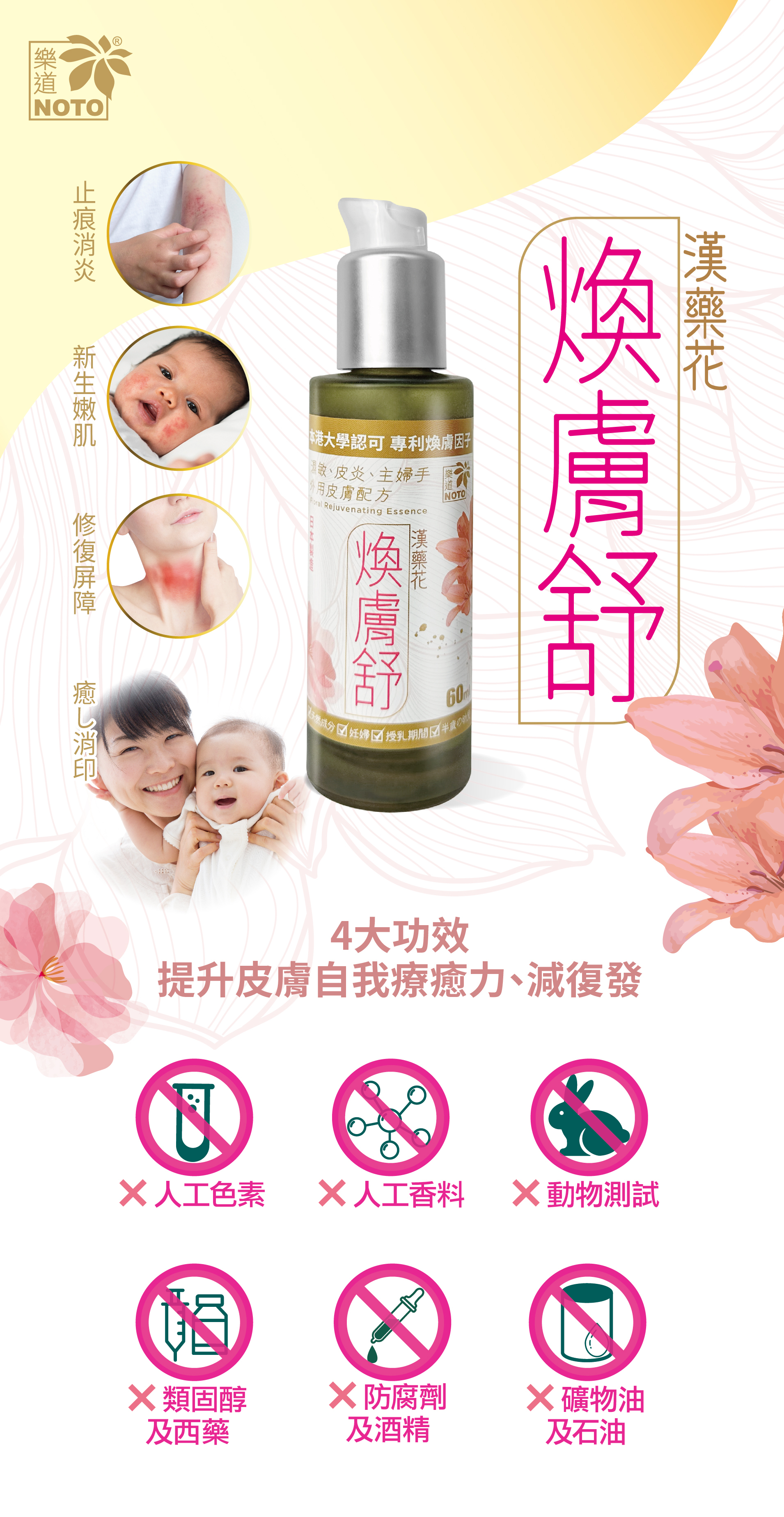 樂道煥膚舒萃取漢藥花精華,含專利煥膚因子,提升皮膚自我療癒力,煥發新肌;配方並獲本港大學認可。針對性局部向濕疹部位消炎助療;並形成一層保護膜,幫助濕疹傷口皮膚癒合;改善痕癢、乾裂及滲液等問題;並鞏固經常復發部位的皮膚保護屏障。外用皮膚專方對濕疹、皮炎、主婦手等長期皮膚問題效果顯著。