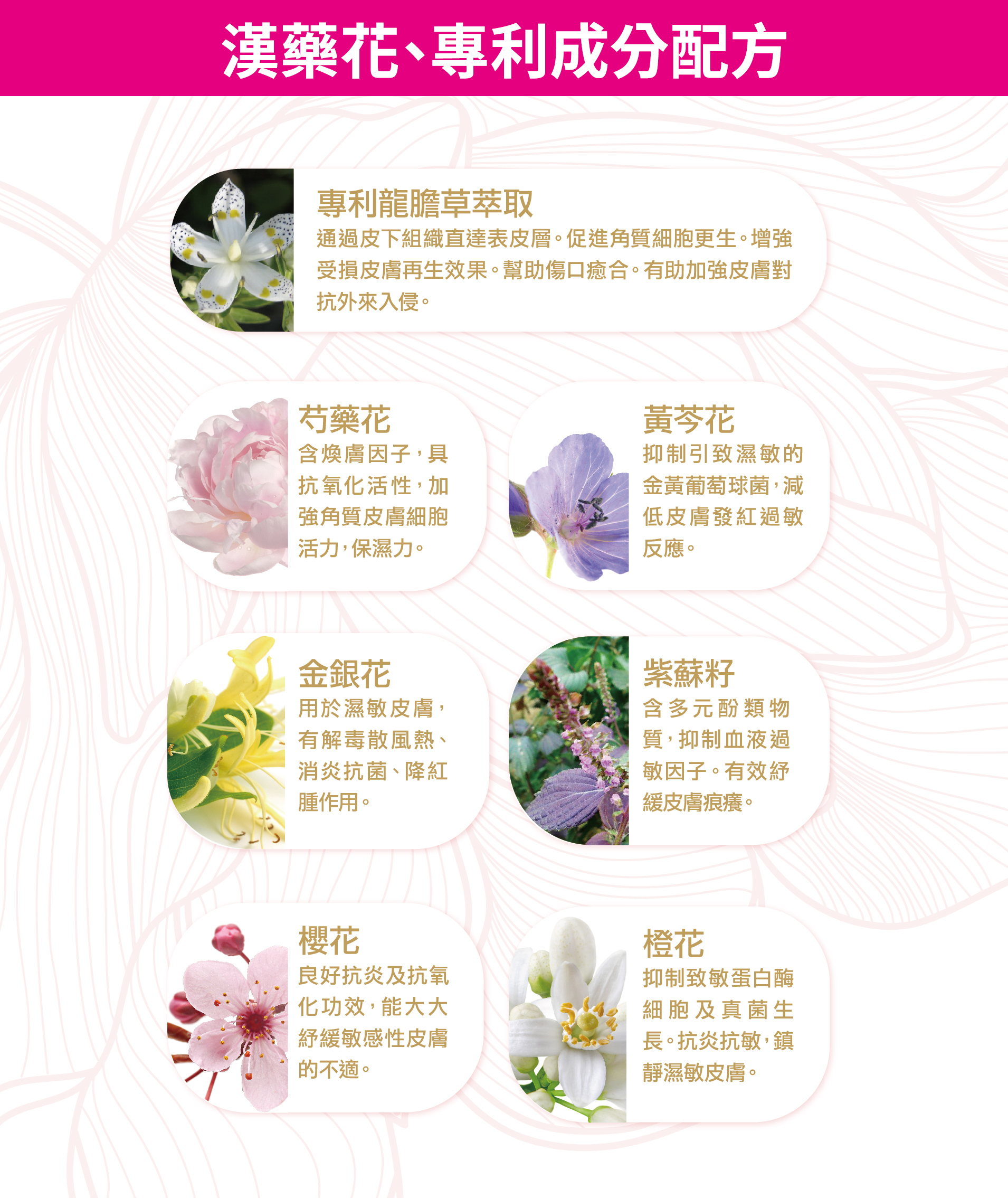 黄芩花萃取、櫻花萃取、橙花油、專利龍膽草萃取、金銀花萃取、芍藥花根及海藻糖萃取、紫蘇籽萃取、蛋黄油、薰衣草油、燕麥醯胺