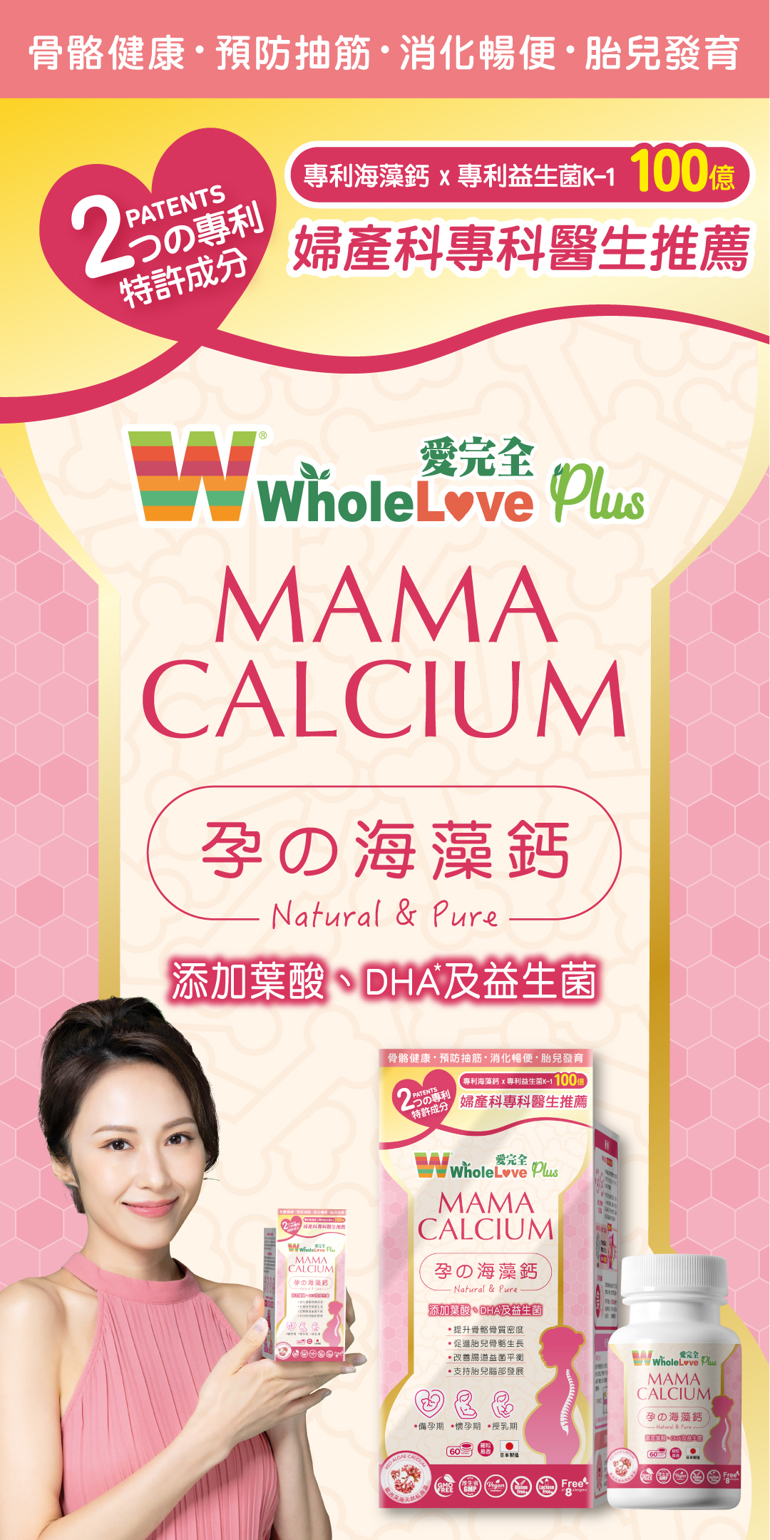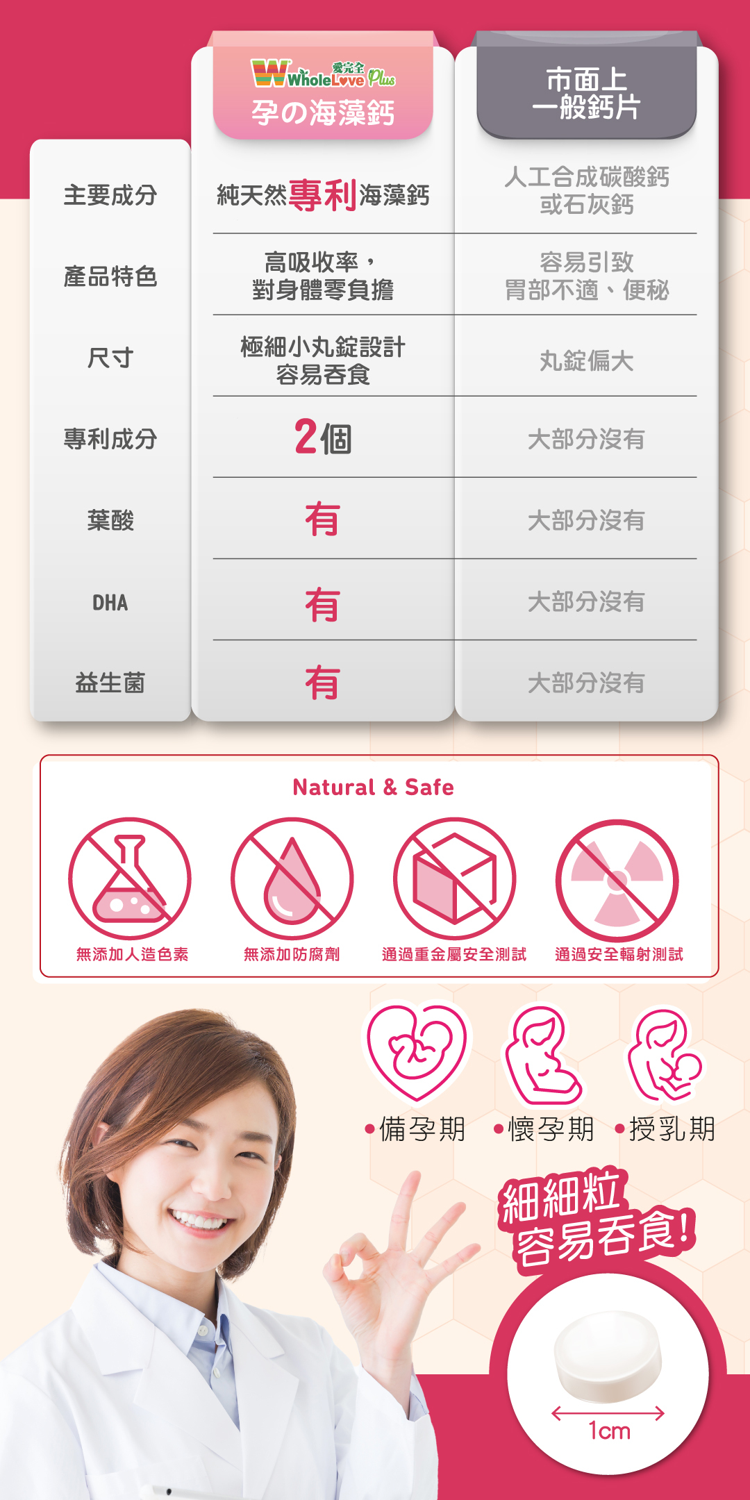愛完全 「孕の海藻鈣」專為孕婦而設的配方,採用深海天然專利紅海藻鈣,更易被人體吸收。集合2大專利成分,特別添加維他命D3、專利益生菌、葉酸和 DHA,建立孕婦金三角鈣配方: 補骨鈣、促消化、助育腦,促進母體和胎兒骨骼健康,預防抽筋,提升腸道健康。配方更獲婦產科醫生權威推薦,日本製造。